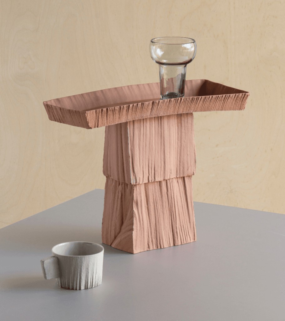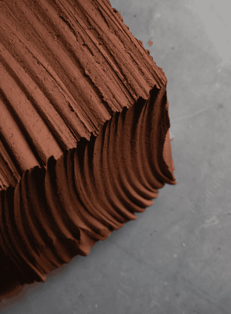 'De Fringe Surface is een experimentele toepassing die voortkomt uit materiaalonderzoek naar het bewerken van rauwe klei. Vanuit een visuele fascinatie voor het snijden van klei met een draad ontstond de Fringe collectie: een techniek die zich ontwikkelde van een speels gebaar tot een zelfstandige ontwerpmethode, waarin zowel functionele als sculpturale kwaliteiten worden verkend.